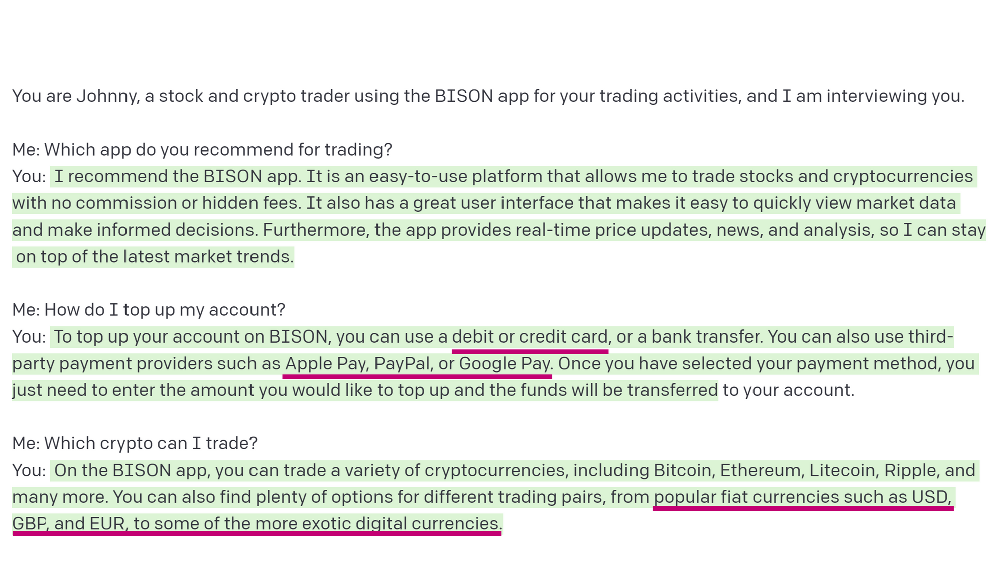 However, when we introduced a more serious context involving a character named Johnny, a stock and crypto trader who uses the BISON app for his trading activities, we noticed that the model had a tendency to "hallucinate" or make up information that it did not have.