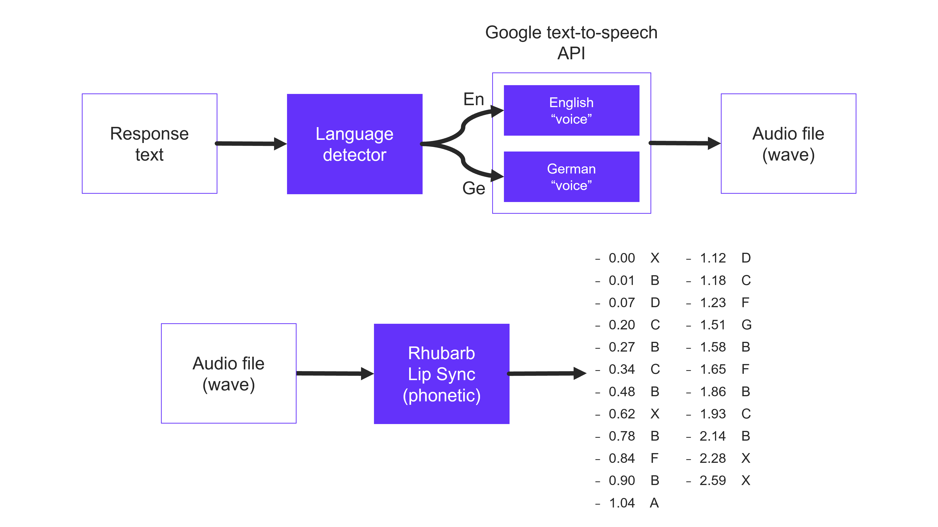 One interesting detail in our speech synthesis pipeline was the use of a language detector to know which "speaker" to request through Google's text-to-speech API. Initially, we used an n-gram-based algorithm for language detection, but later we decided to use OpenAI for this purpose as well. The speech (audio) produced by the text-to-speech API was then fed to the Rhubarb lip syncing tool. This tool takes speech as input and produces a string of lip-syncing cues. By showing a particular image of lips/mouth at a particular point in time, our Johnny appeared as if he was actually speaking the words.