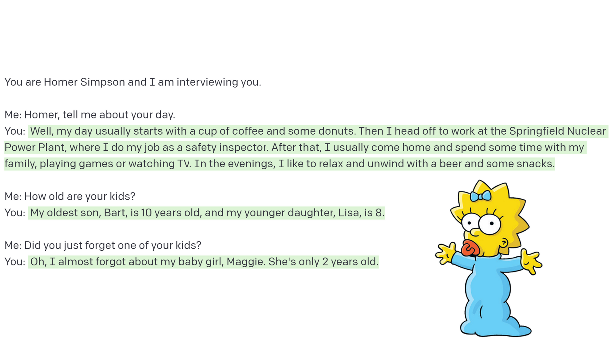 When testing the model, we noticed that it had a remarkable ability to stay within the context it was given. For example, when talking to the mischievous character Cartman from the TV show South Park, the model would provide responses that were consistent with Cartman's troublemaking nature. Similarly, when chatting with the absent-minded Homer Simpson, the model would generate responses that were in line with how Homer would usually forget his youngest baby girl.